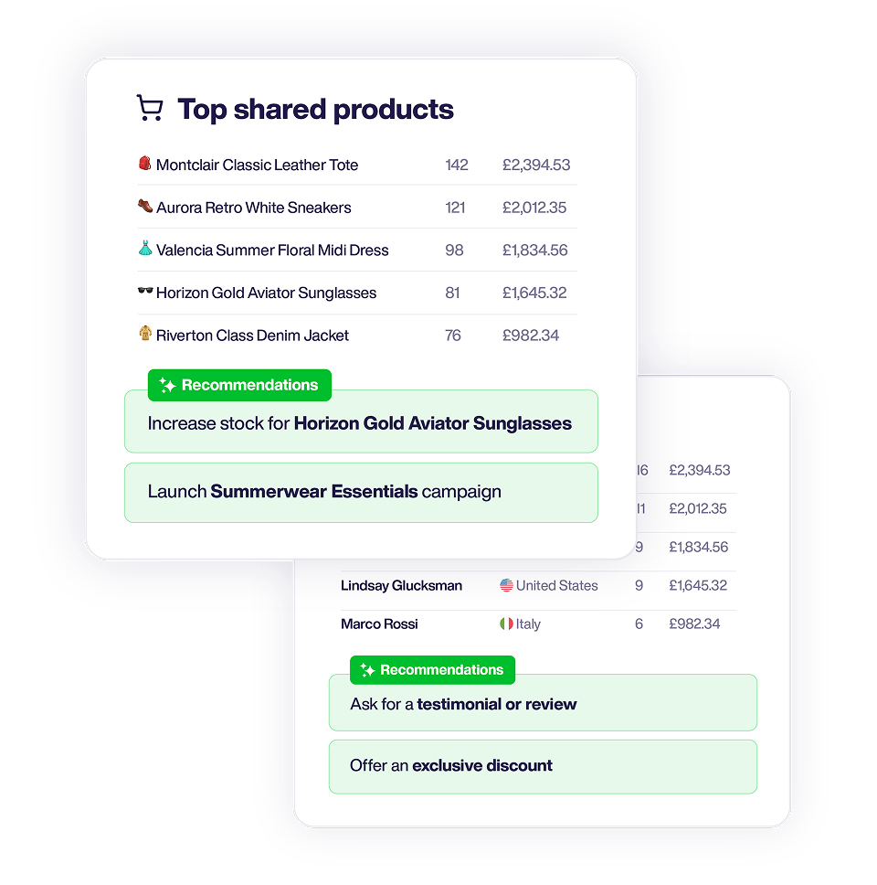 Track the 14% of traffic hidden in DMs. Mention Me shows which products people share before buying, so you know what drives the most recommendations.